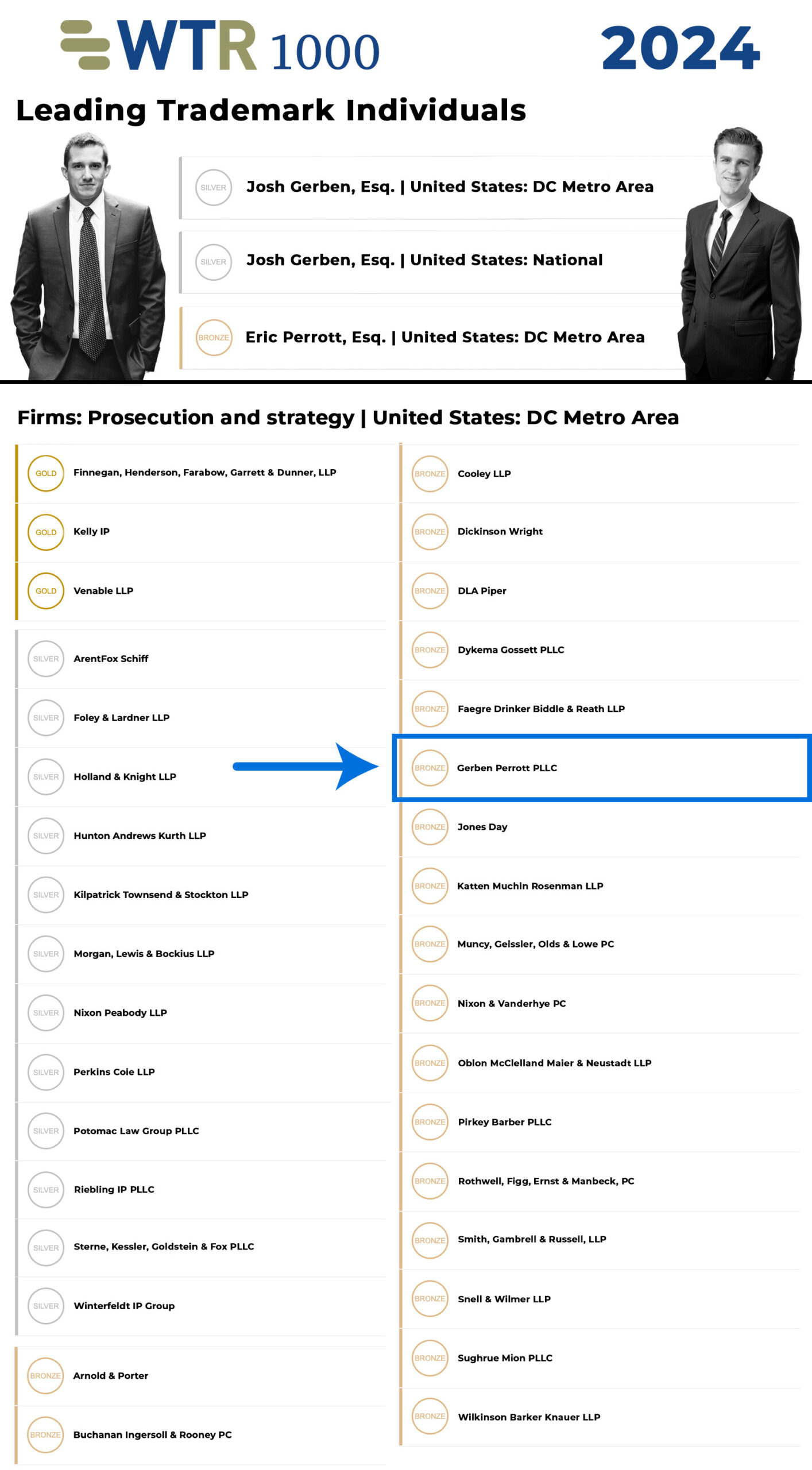 In the 2024 WTR guide, Gerben IP was recognized in the DC Metro area as a top firm for trademark prosecution and strategy. The guide also recognized both Josh Gerben and Eric Perrott as leading individuals for trademark prosecution and strategy.